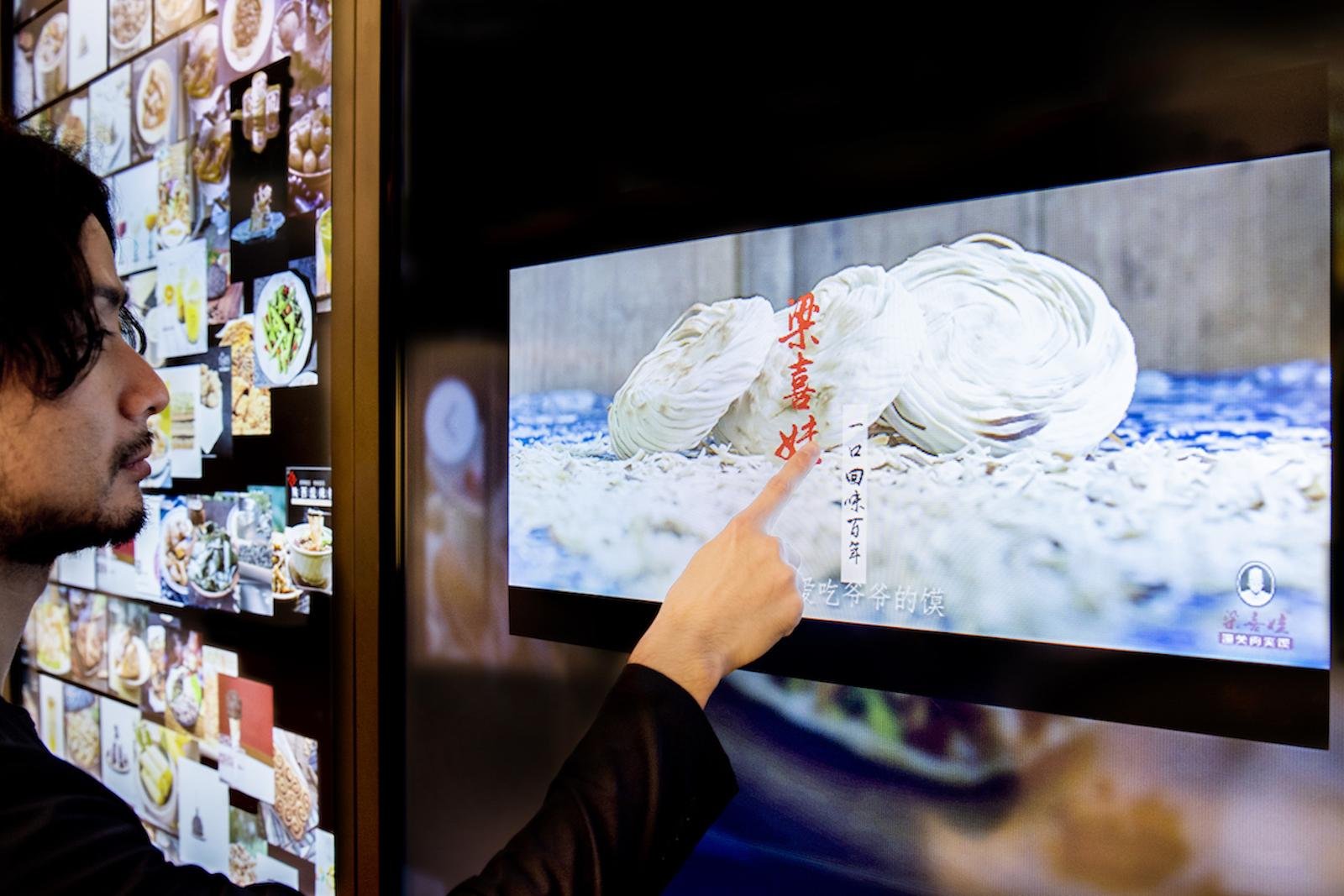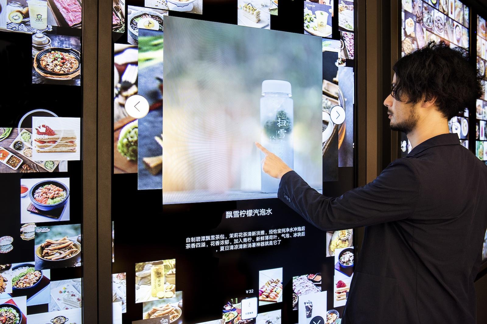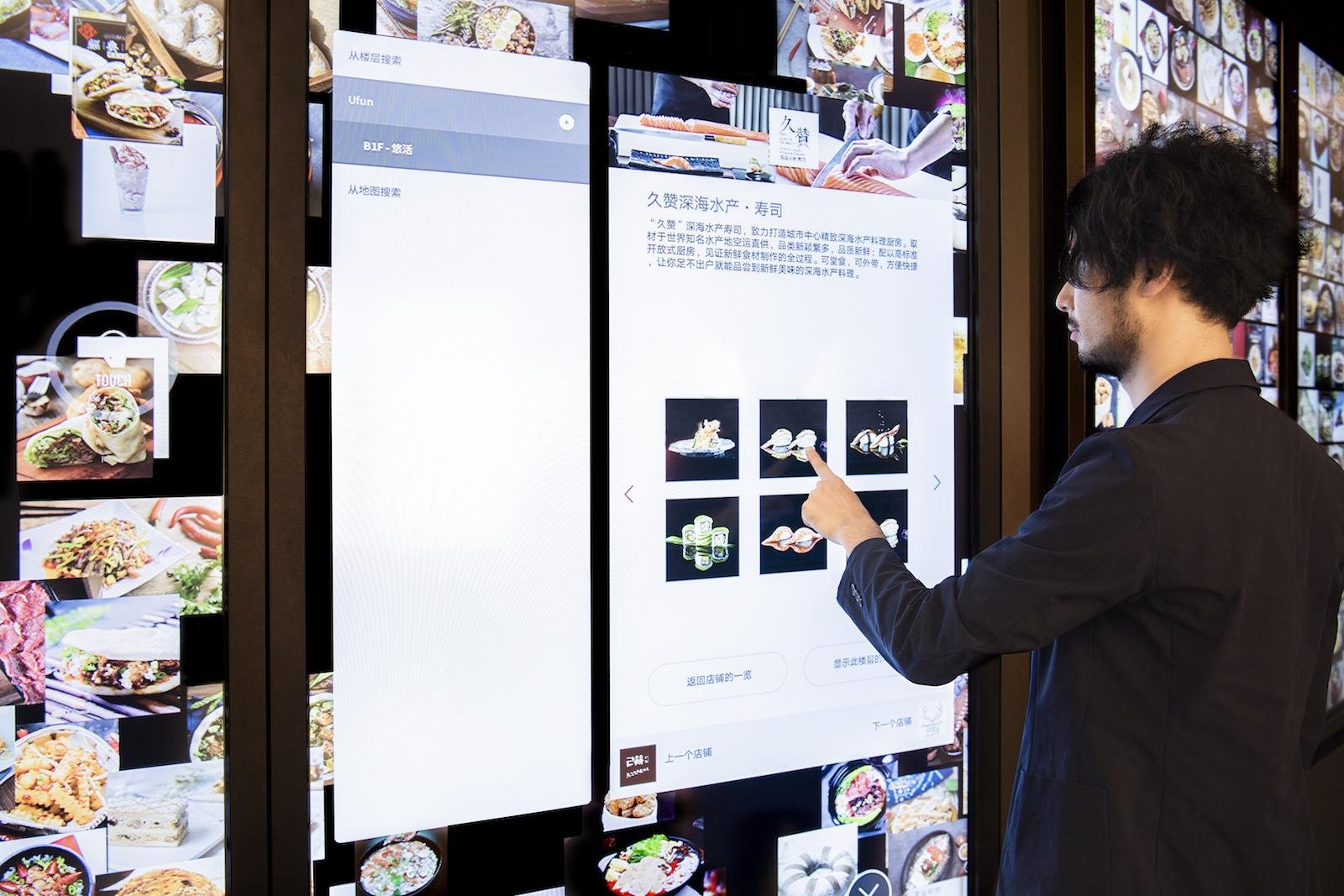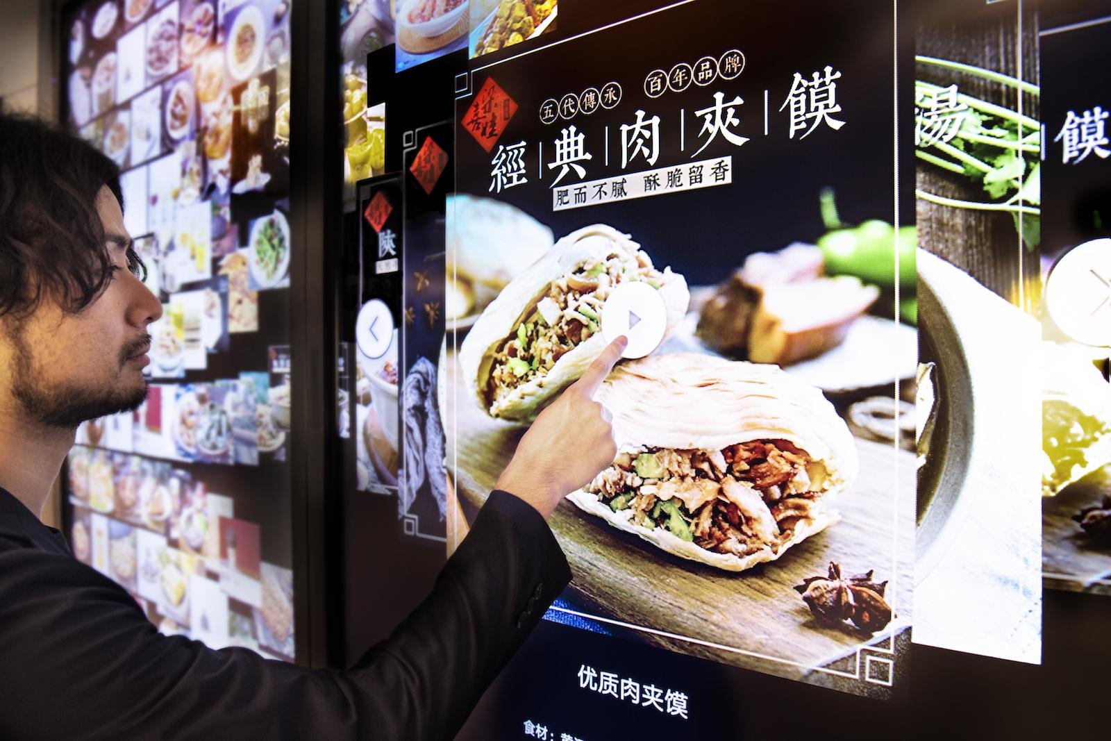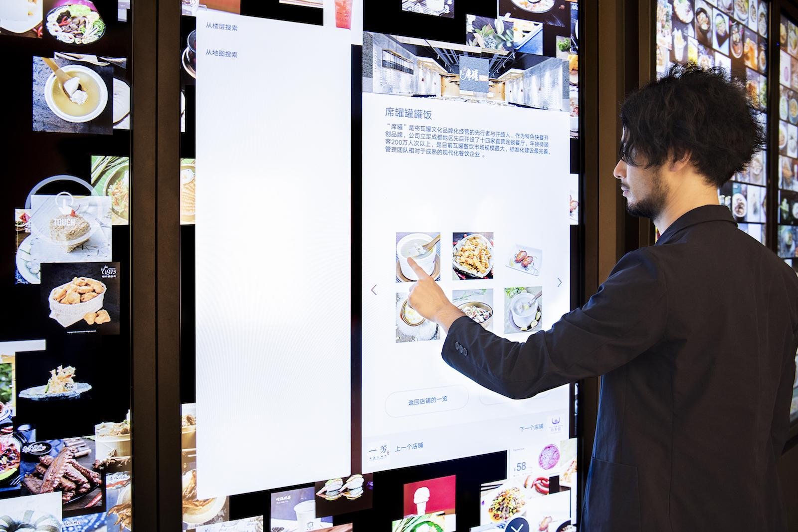 大型タッチモニターには、空間いっぱいに飲食店の情報が表示され、前を通過する来館者に反応して興味を惹きます。