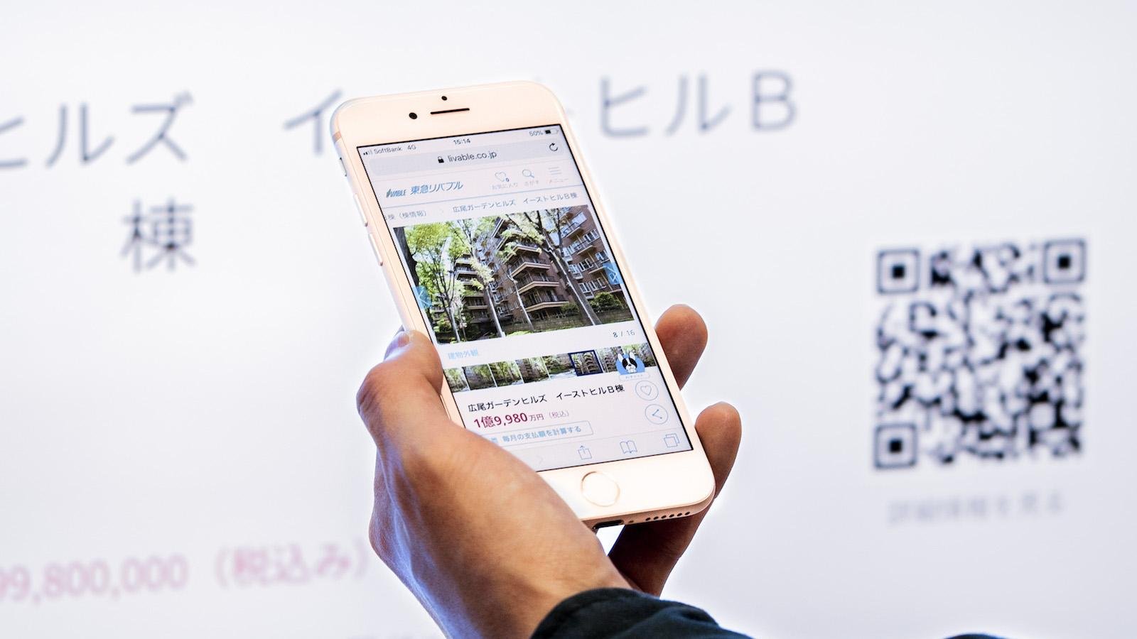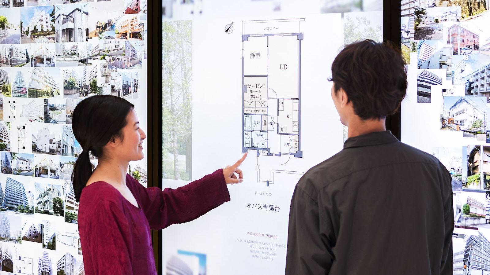 大型タッチモニターには、空間いっぱいに東急リバブルが扱う物件情報が広がっています。気になる画像にタッチすると拡大され、詳細情報を見ることができます。さらに、間取り図や内観写真も同時に見ることができ、その場にいるだけでたくさんの情報と出会えます。