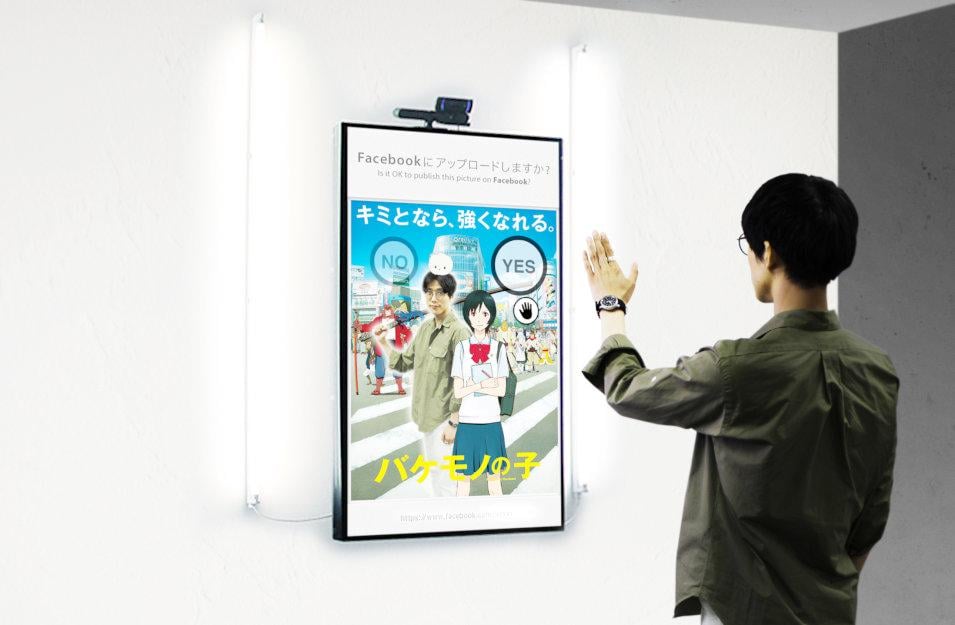 自動的に撮影を行うFacebook連動型のデジタルサイネージです。サイネージの前に立ち、撮影ボタンを押 すと自動的に撮影が始まり、様々な加工を施された画像が、『バケモノの子』展特設ページにアップロードされます。今回は『バケモノの子』展バージョンの6 種類のビジュアルをご用意致しました。
