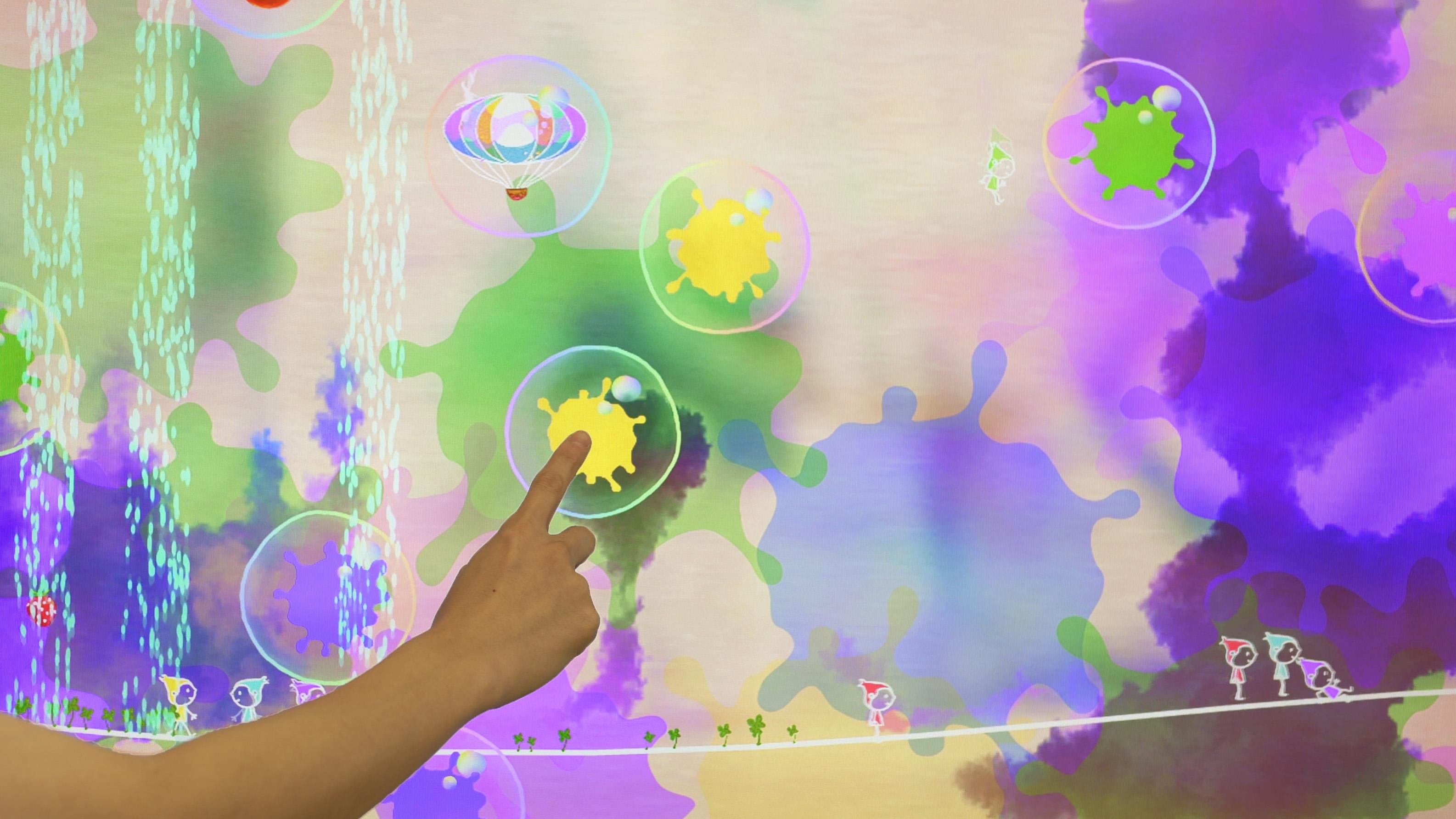 絵の具が入っているシャボン玉に触れて割ると、飛び散って、キャンバスの色を変えていきます。