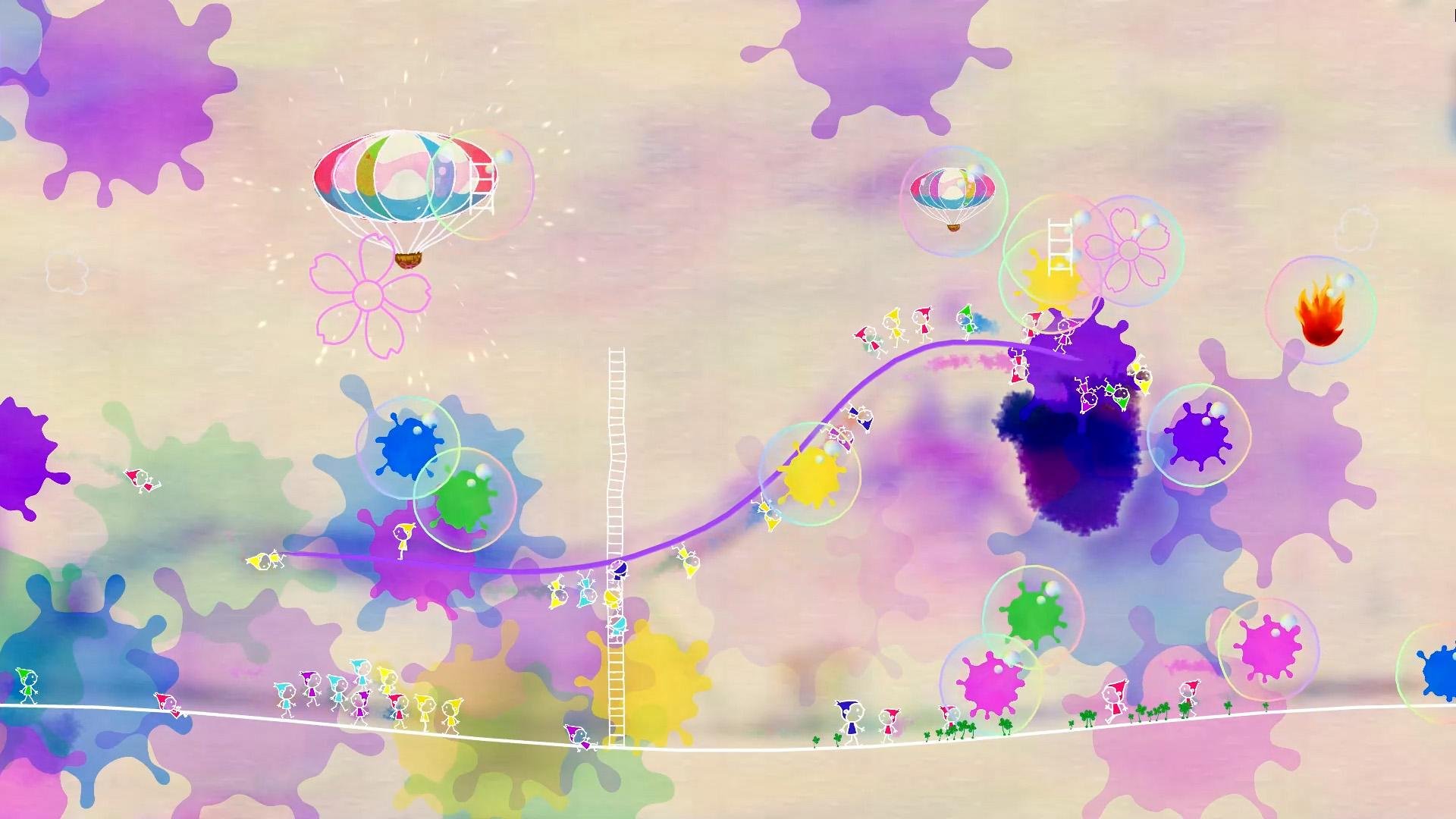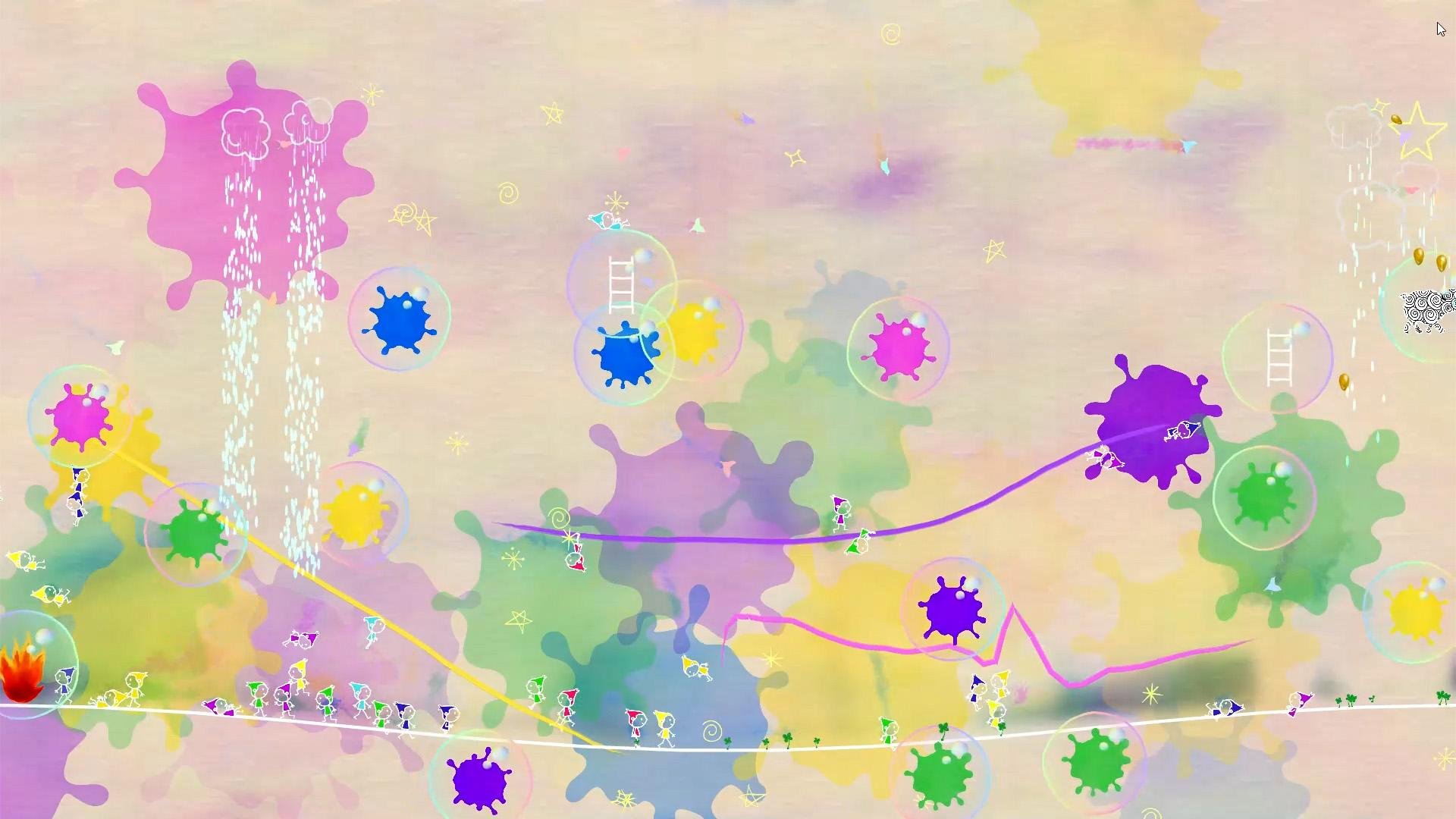 はしご、火の玉、キノコ、羊、ボール、気球、花のシャボン玉に触れて割ると、落ちてきて、こびとたちの世界に様々な力を与えます。