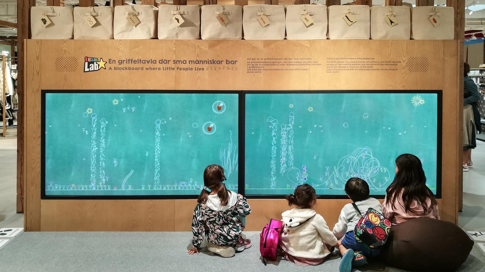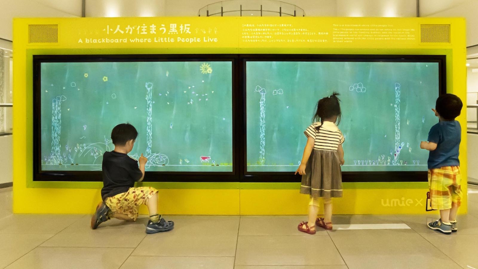The little people run around and do not notice us, but touch the little people or the floating bubbles and the world of the blackboard world will change in response to the touch.