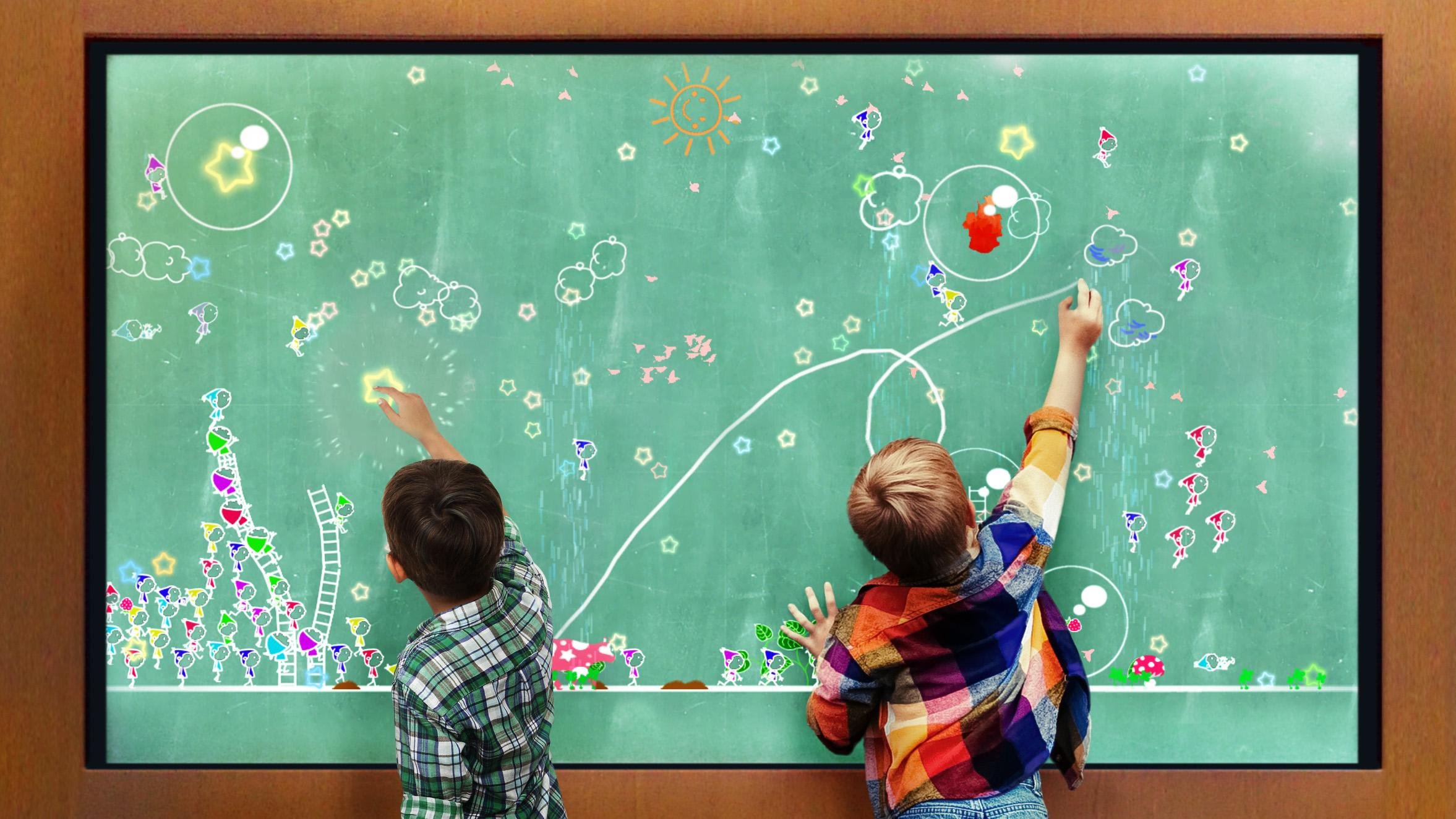 《こびとが住まう黒板》の中には、こびとが住んでいます。黒板の中のこびとやシャボン玉などにタッチしたり、線を引いたりすると、インタラクティブに世界が変化していきます。
