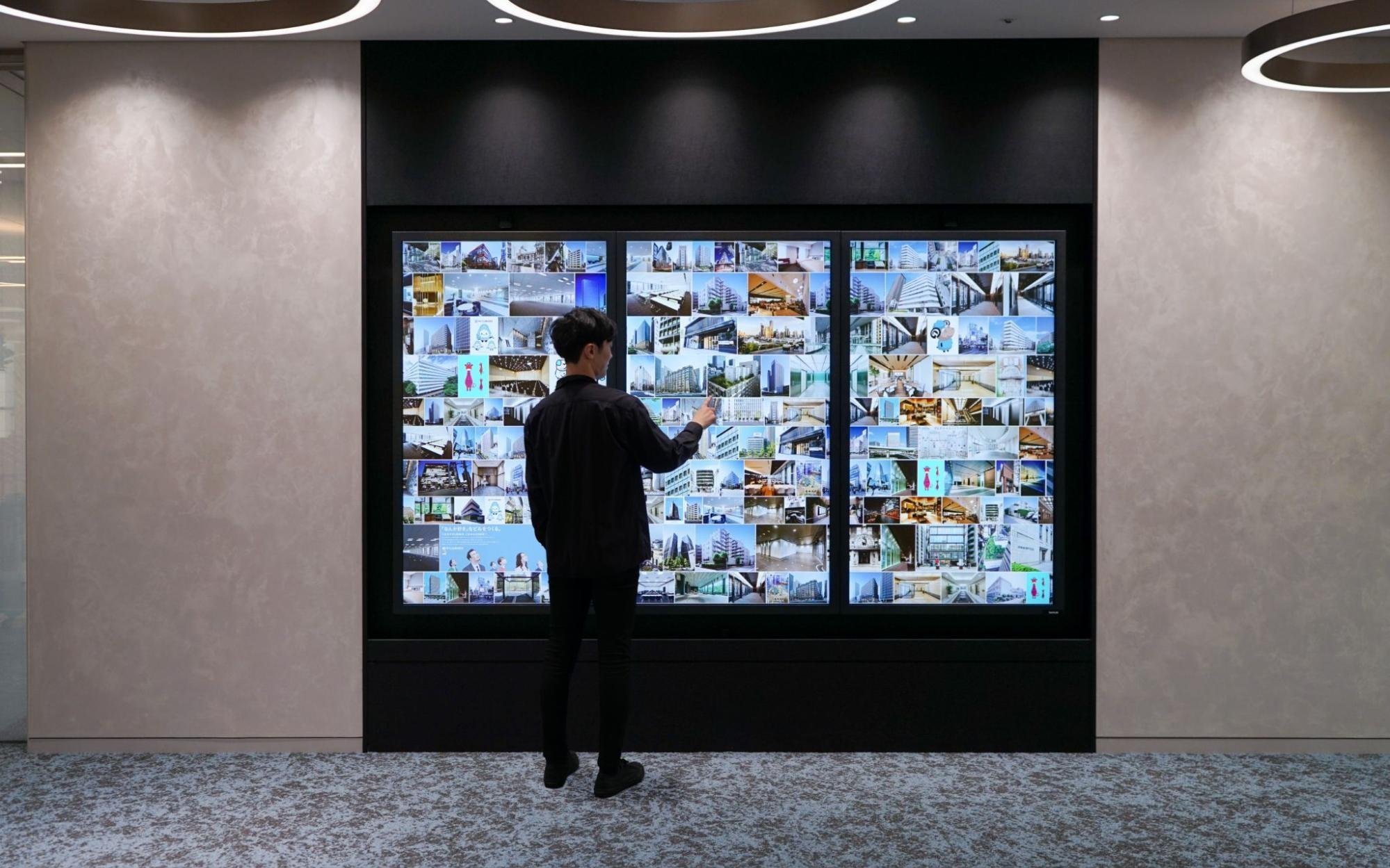 大型タッチパネルサイネージには、ダイビルのこれまで手掛けた物件、企業の情報や広告の画像が広がっています。気になる画像や動画にタッチすると拡大され、物件の詳細情報などをインタラクティブに見ることができます。
