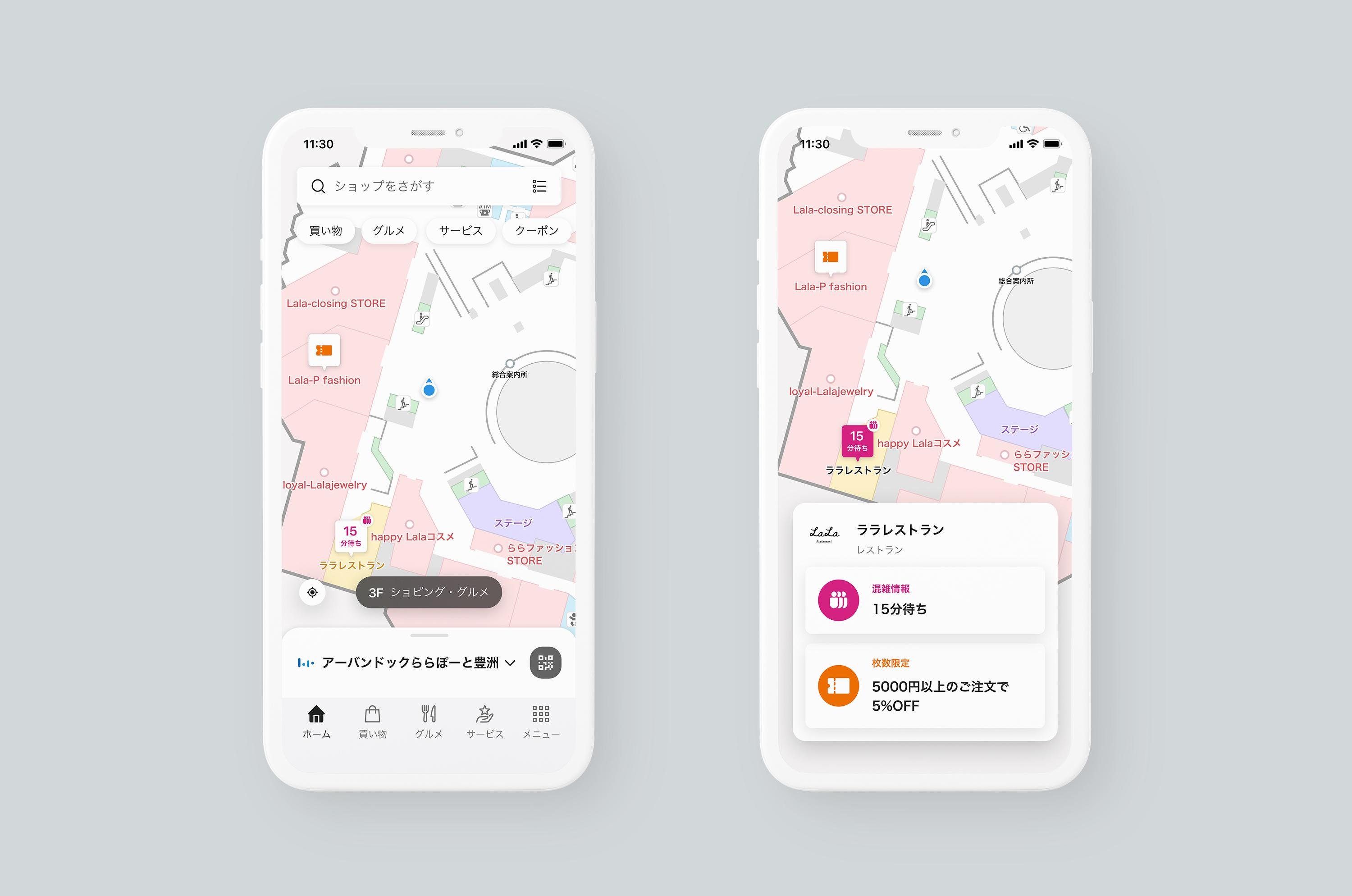 位置情報と連動して周辺にある店舗、設備を簡単に確認でき、分断されやすい情報・特典や、その場で利用する機能をまとめることで、ユーザーが探さずとも、施設滞在中の体験により集中できる設計の、デジタルフロアマップを導入しました。ららぽーとや三井アウトレットパークなどの全国約60の商業施設で利用できます。