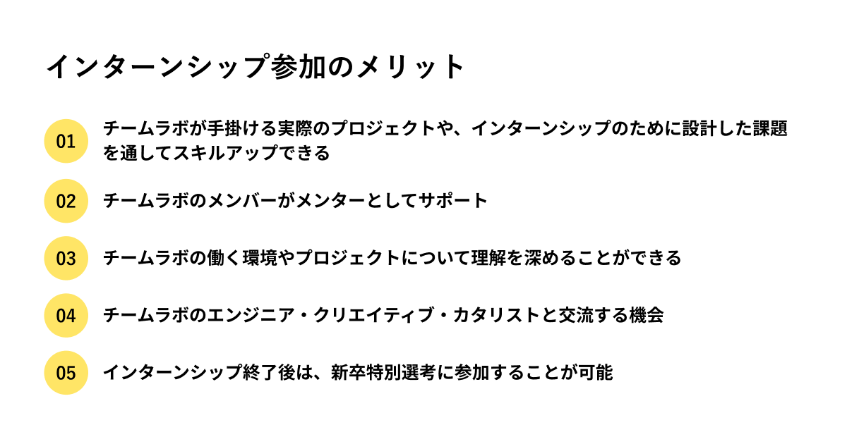 インターンシップ期間中は、チームラボのメンバーが専属のメンターとして、一人ひとりサポートします。参加するプロジェクトの内容は経験、スキル、関心をもとにご用意します。インターンシップ終了後は、新卒特別選考ルートにご参加頂くことも可能です。