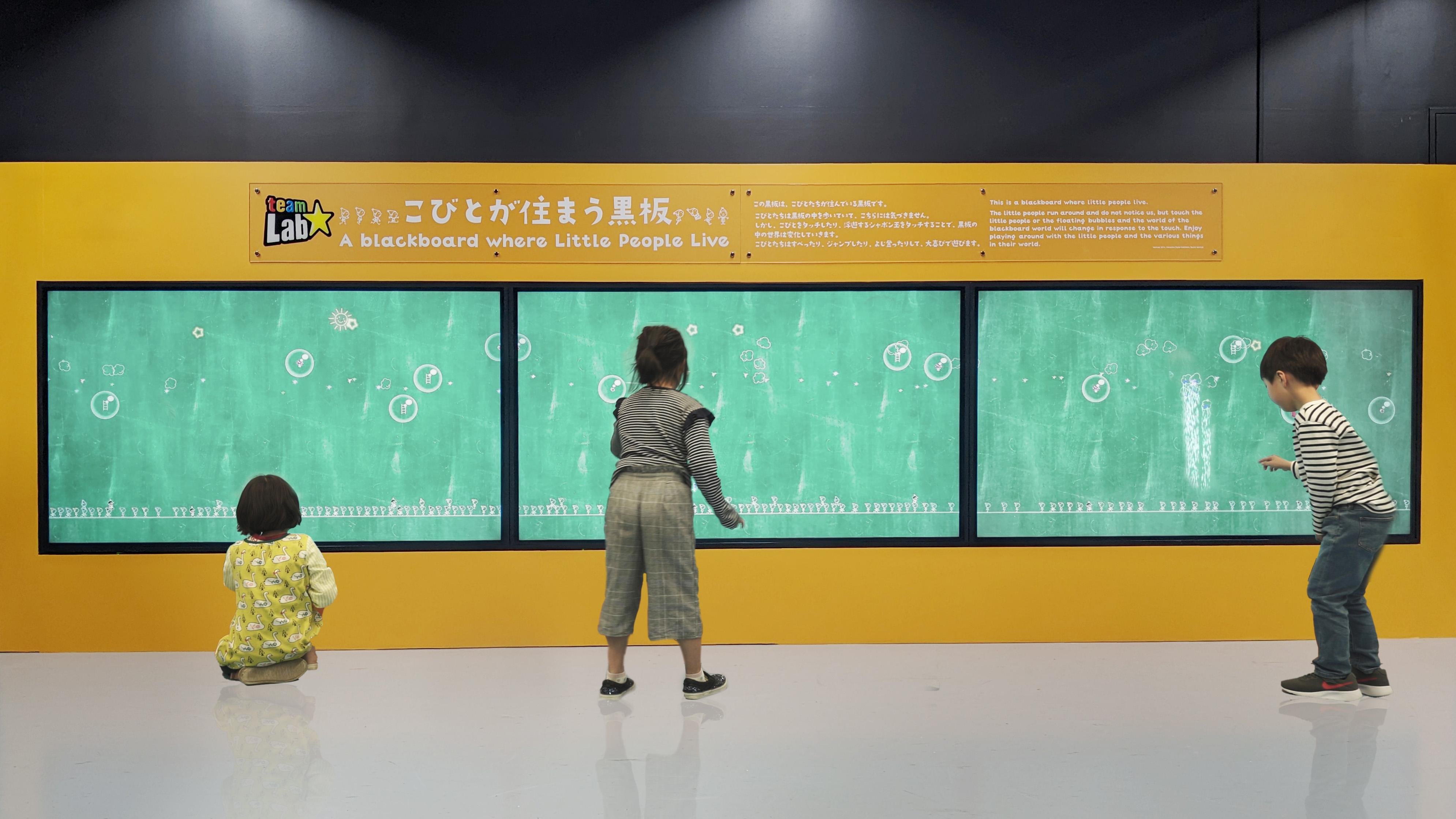 《こびとが住まう黒板》の中には、こびとや、読売ジャイアンツの球団マスコットキャラクターである「ジャビット」が住んでいます。こびとたちは黒板の中を歩いていて、こちらには気づきません。しかし、黒板の中のこびとやジャビット、シャボン玉などにタッチしたり、線を引いたりすると、インタラクティブに世界が変化していきます。
