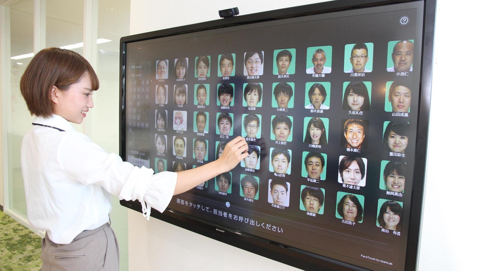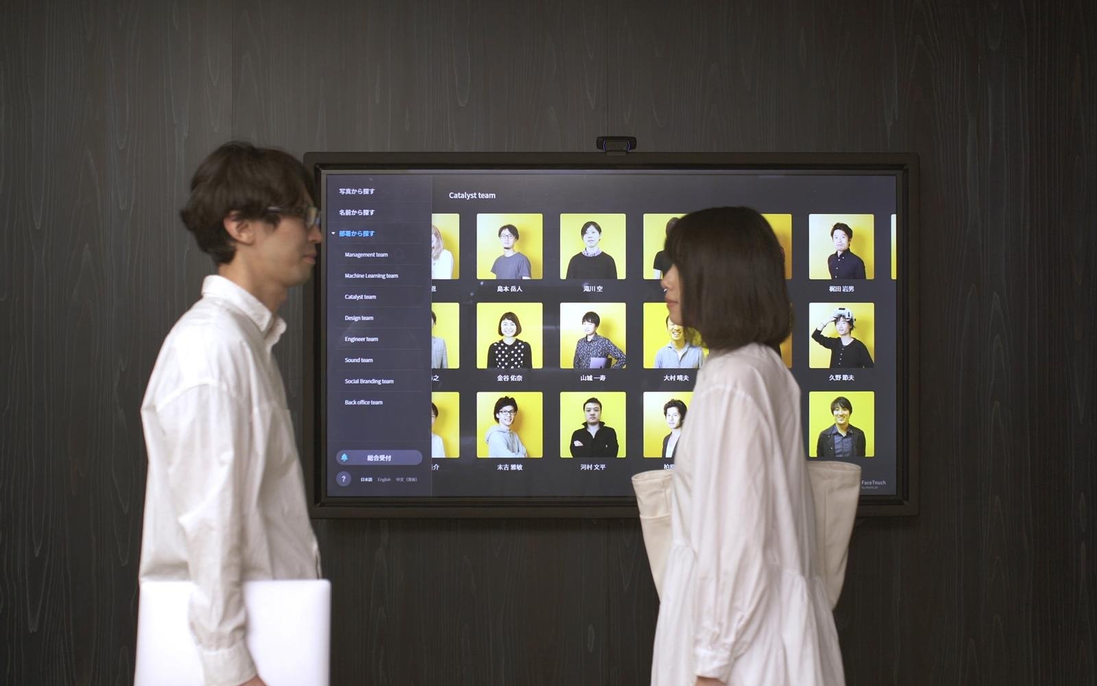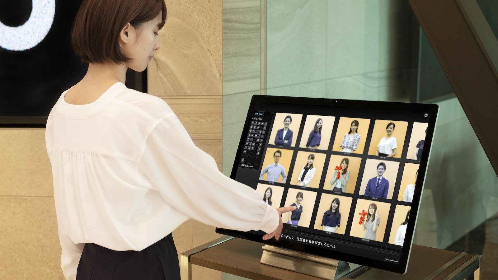 FaceTouchは、写真を見て、プロフィールを見て、担当者を探すことができる無人受付システムです。