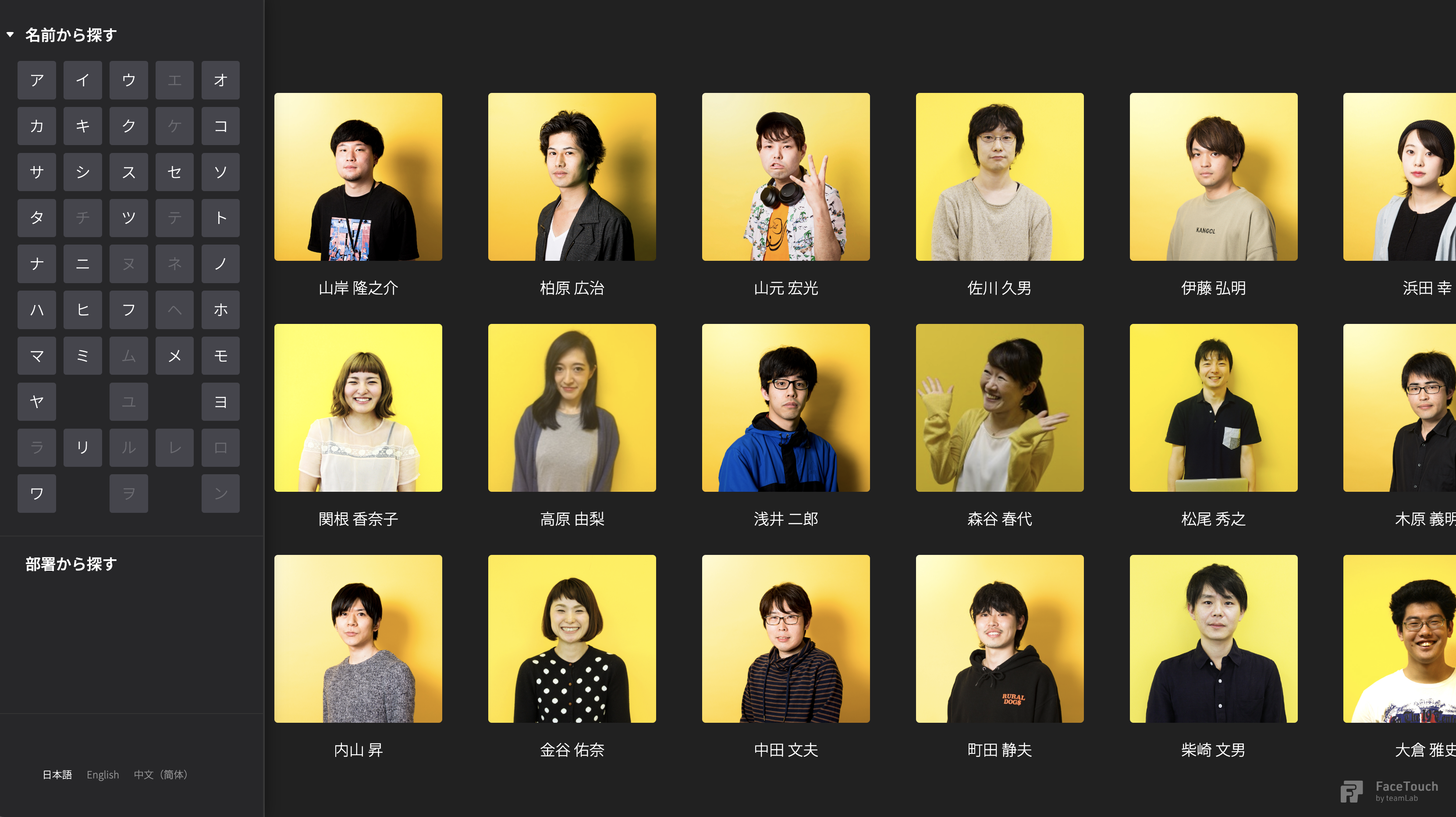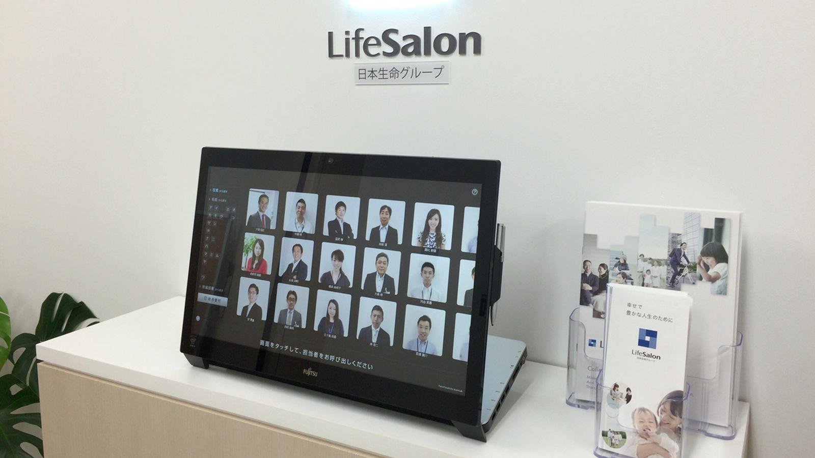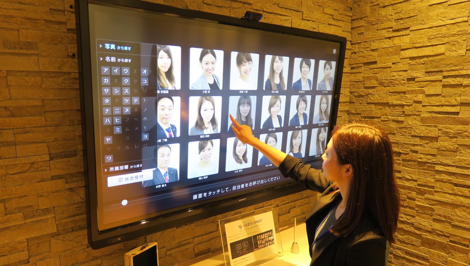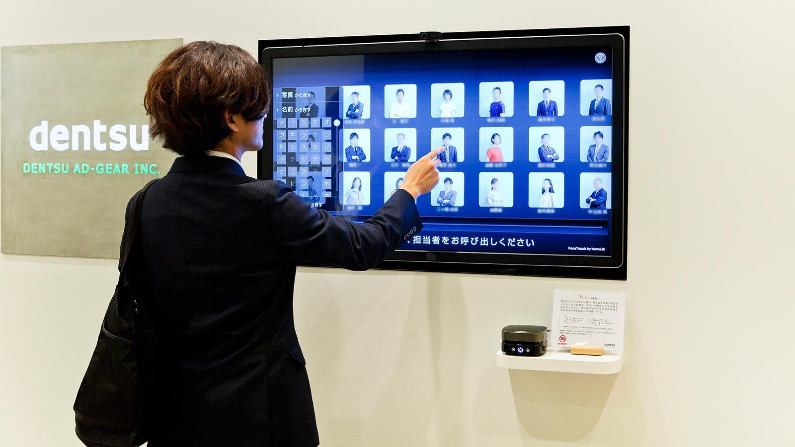 FaceTouchは、写真を見て、プロフィールを見て、担当者を探すことができる無人受付システムです。