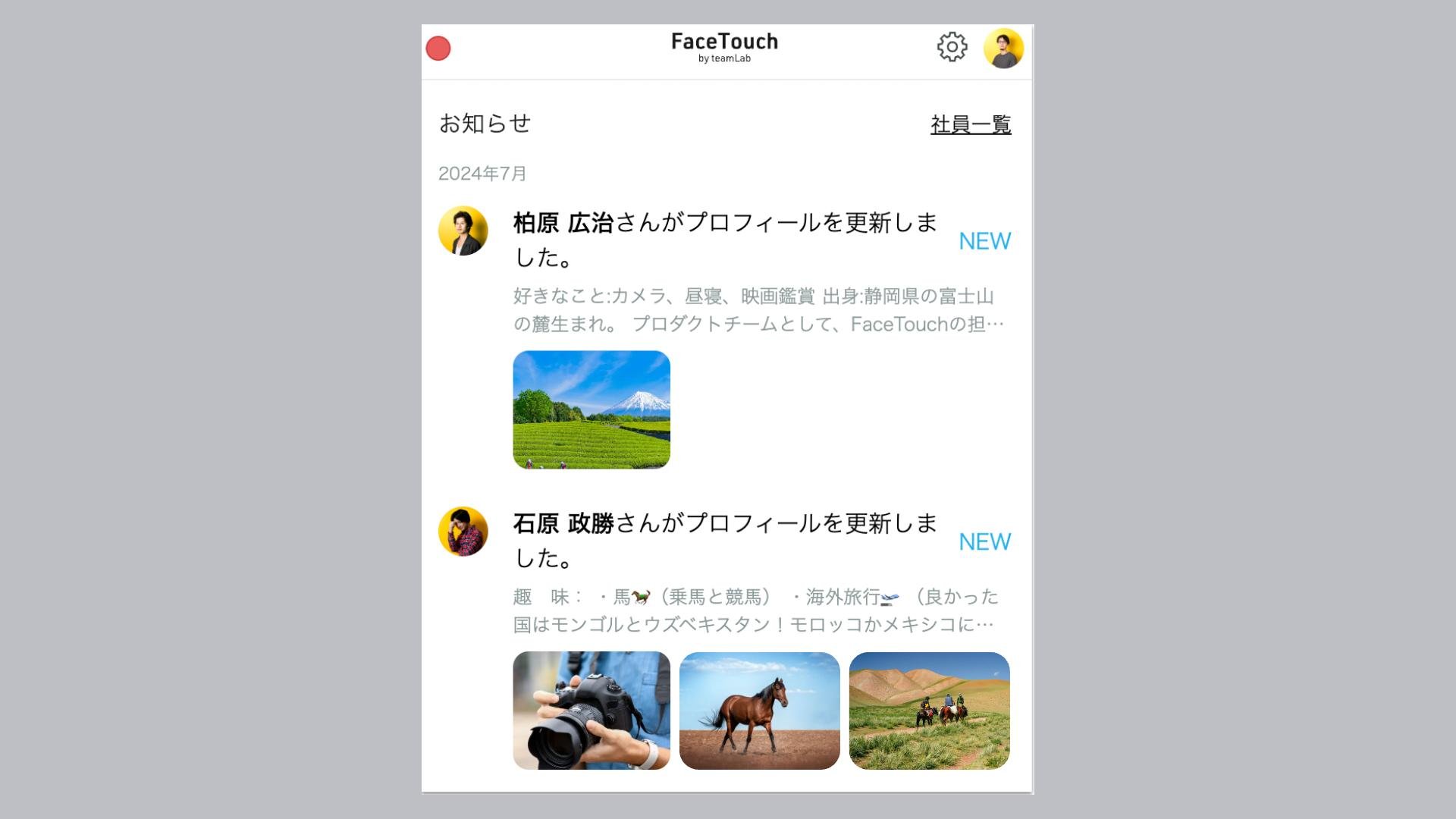 社員のプロフィール更新情報は、FaceTouchアプリにお知らせで届きます。