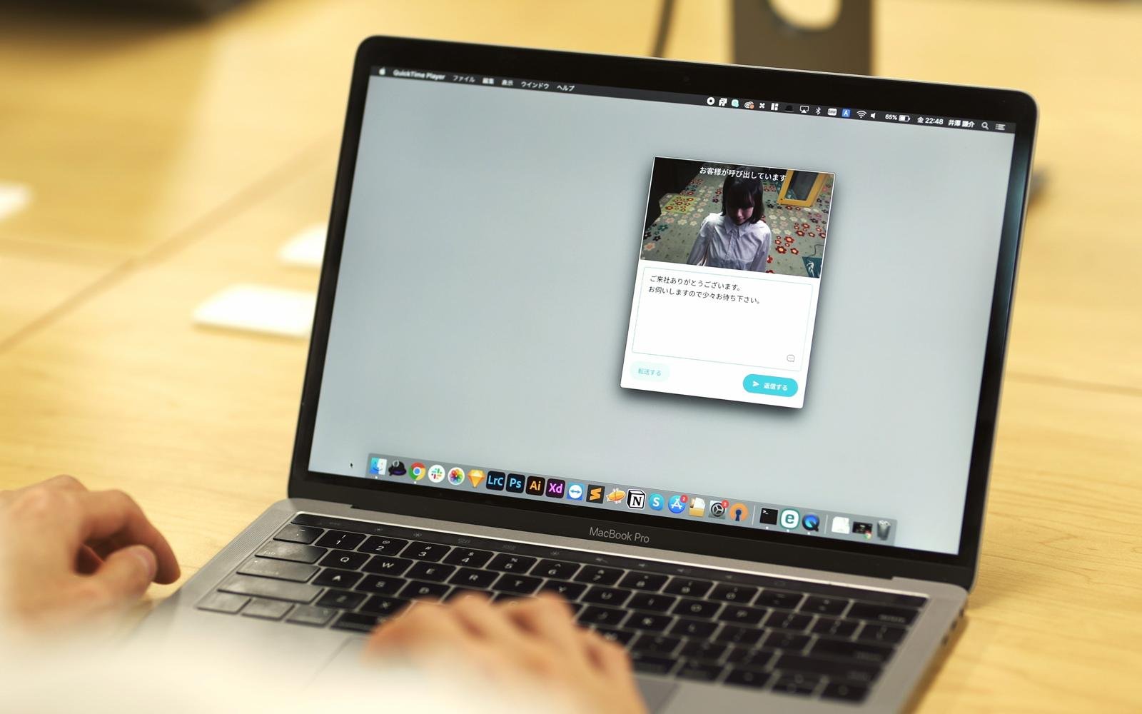 呼び出しがあるとFaceTouchアプリが立ち上がり、WEBカメラを通じて来訪者の姿を確認しながらメッセージで応答できます。