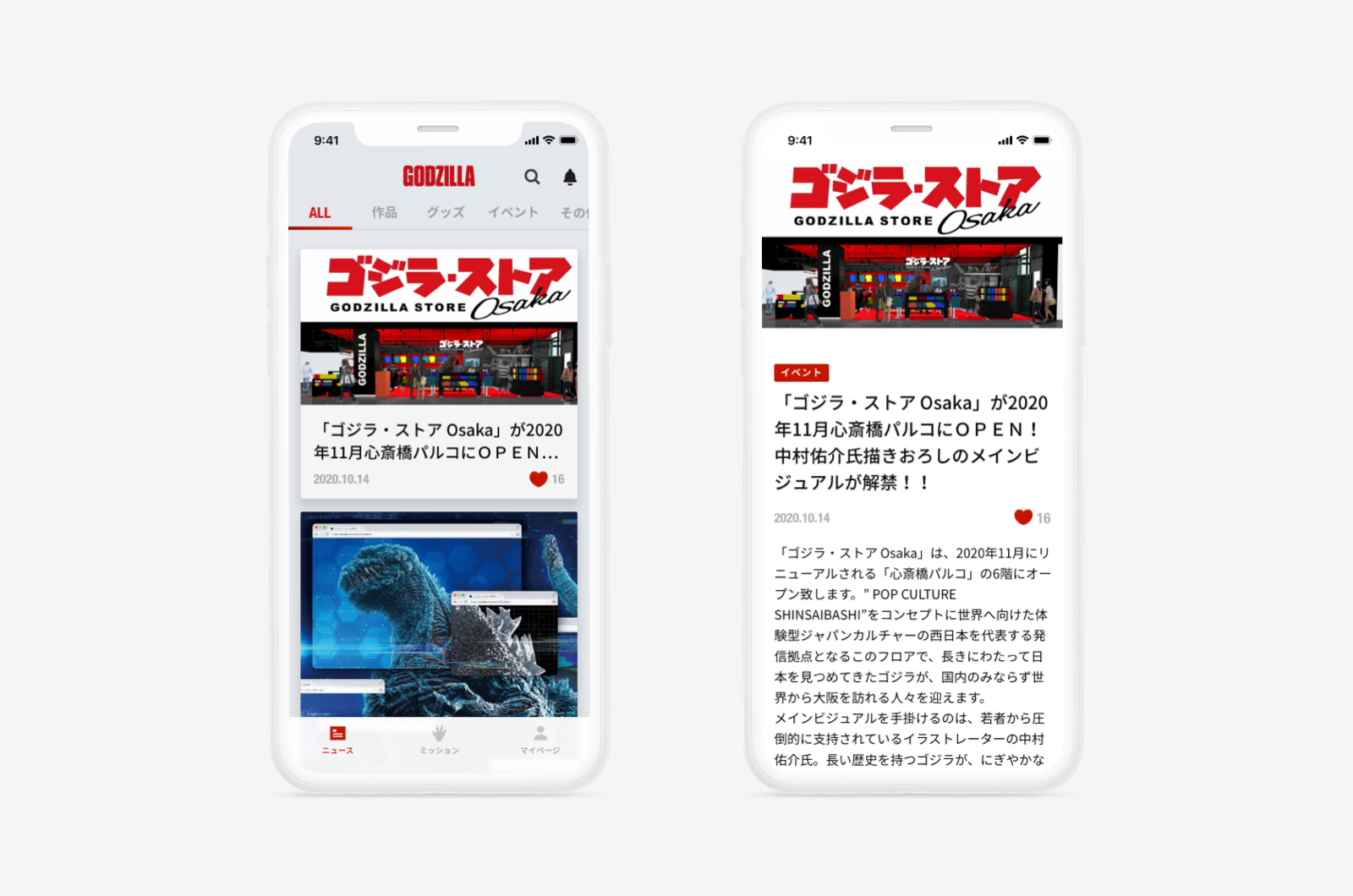 これまで、それぞれ独立して情報発信されていたゴジラの最新情報をアプリに集約。ニュースフィードで、映画、グッズ、イベントのカテゴリ情報を横断的に見られるニュース機能や、特定のカテゴリのみのお知らせを受け取る機能など、各カテゴリのファンのニーズに対応。