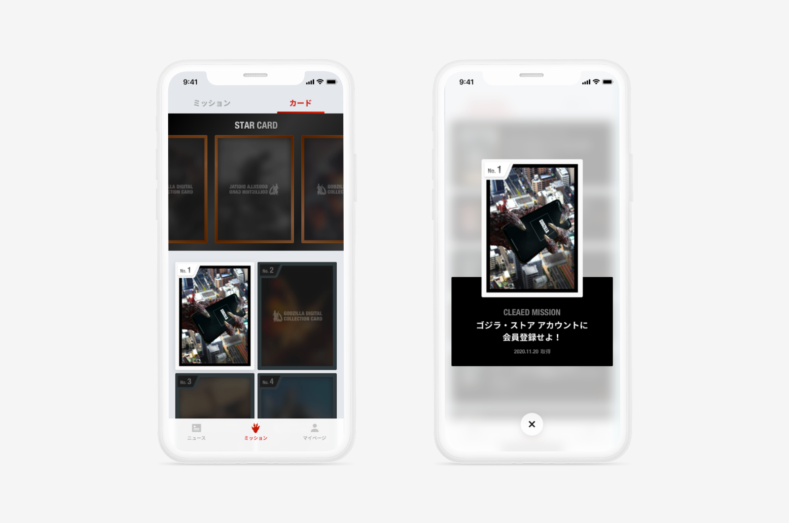 アプリで配信される各種ミッションをクリアすると、アプリ限定のデジタルカード「GODZILLA DIGITAL COLLECTION CARD」を獲得。期間限定のミッションや、ゴジラの聖地やTOHOシネマズなど指定された箇所にチェックインをする等、様々なミッションが随時追加予定。
