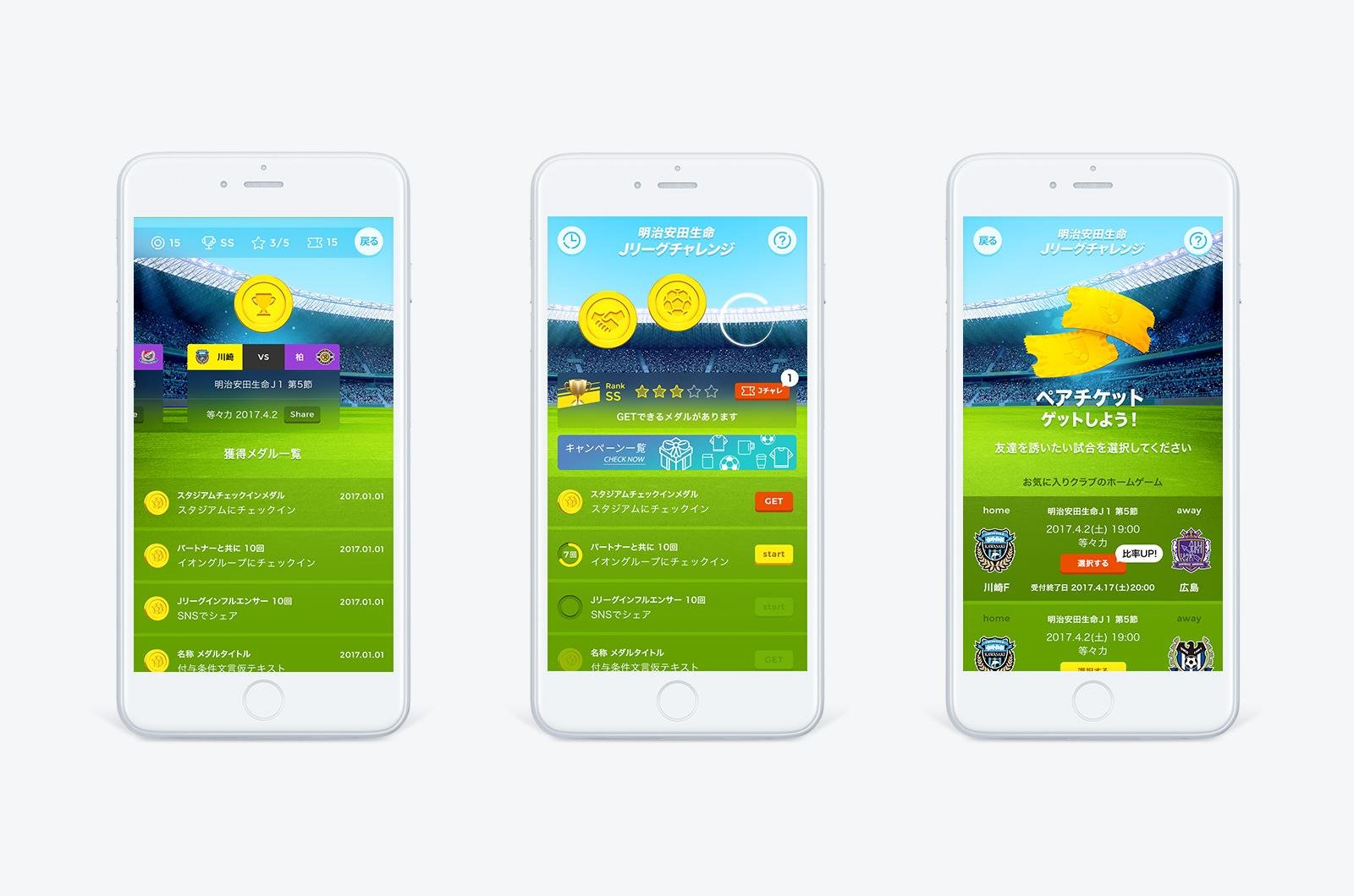 観戦を重ねることで、「明治安田生命Jリーグチャレンジ」に挑戦することができ、当たりが出ると友達を誘うためのペアチケットを手に入れることができます。