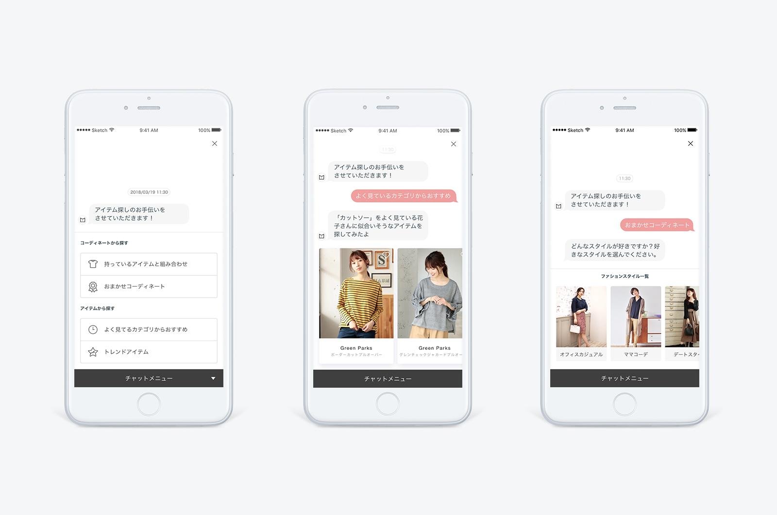 「よく見ているカテゴリからおすすめ」「おまかせコーディネート」「レンタル中のアイテムと組み合わせ」「トレンドアイテム」からなる4つのメニューと、アプリ内の行動履歴を元に、パーソナライズされたコーディネートやアイテムをチャットボットが提案。ユーザーの商品探しをより便利にお手伝いします。