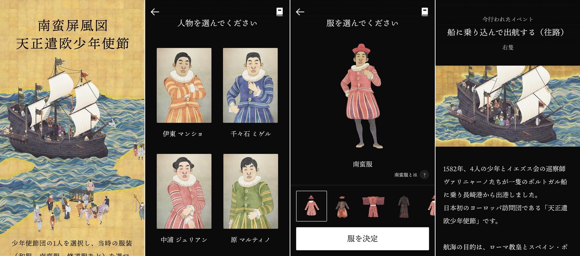 スマートフォンやタブレットを使って、少年使節団(伊東マンショ、千々石ミゲル、中浦ジュリアン、原マルティノ)の1人を選択し、当時の服装(和服、南蛮服、修道服など)を選びます。作品に向かって投げ込むと、選んだ少年に命が吹き込まれ、作品世界に登場します。少年使節団が4人揃うと、ヨーロッパ訪問や布教のための活動の様子が描かれます。