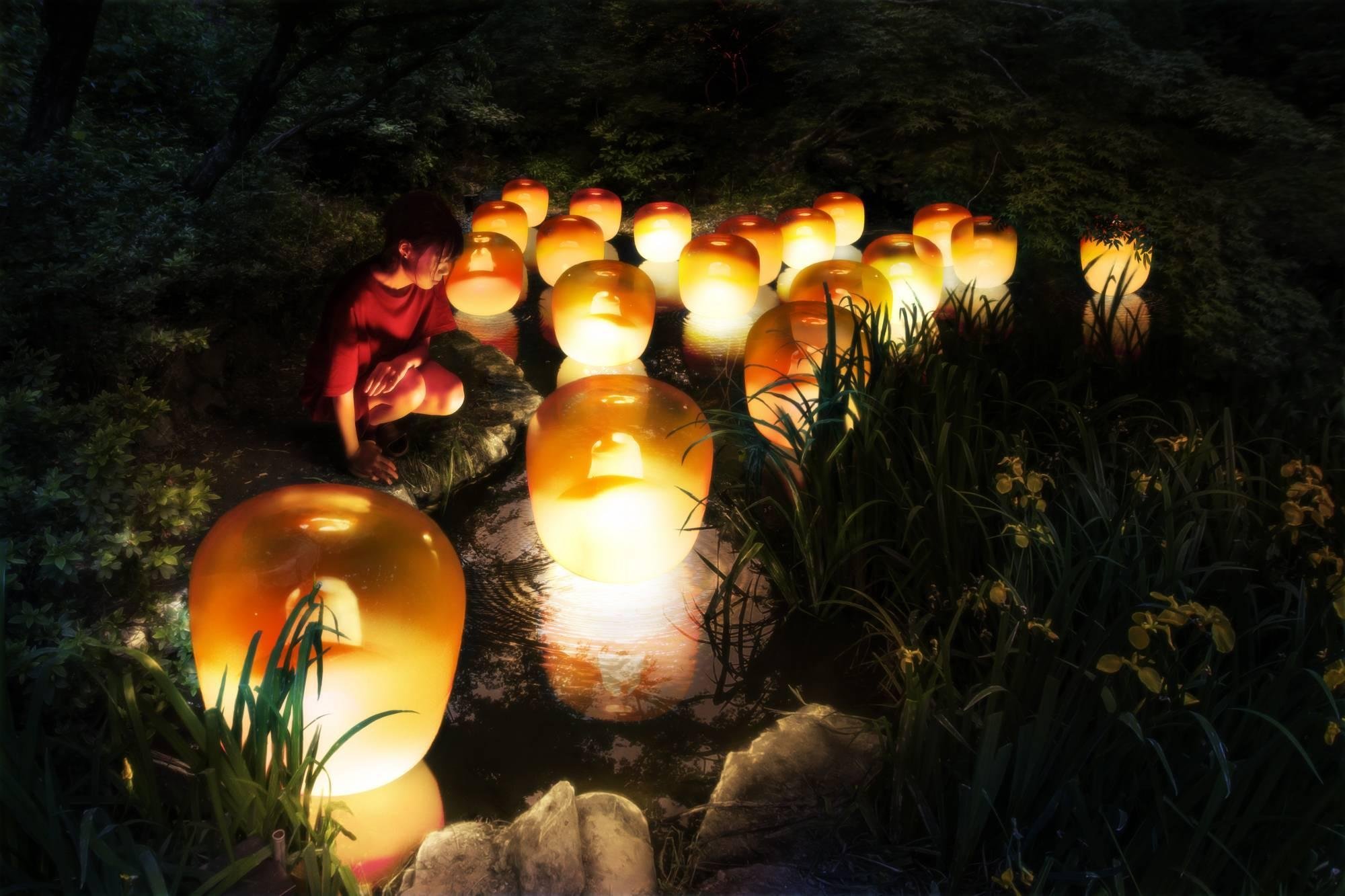 水面に立ち浮遊するランプは、それぞれ自立しており、ゆっくりと呼吸しているかのように強く輝いたり消えたりしている。