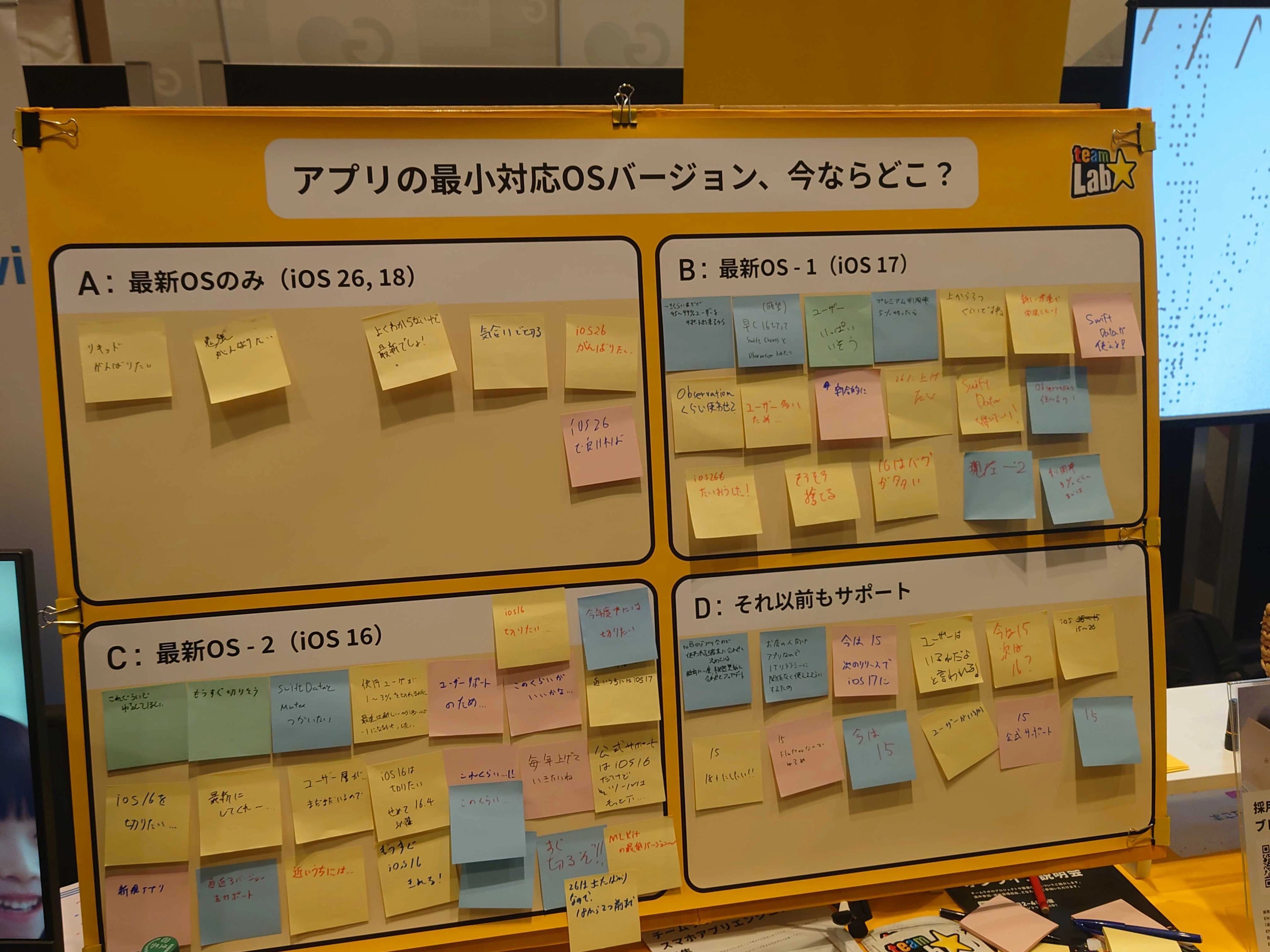 iOSの対応状況に関するアンケートでは、最新OS -1, -2あたりの対応が多く、たくさんの会社さんの事情が聞けました。技術的にはiOS16を切りたいという意見も多かったですが、ビジネス要件でOSが切れない苦労話などもたくさん聞けました。