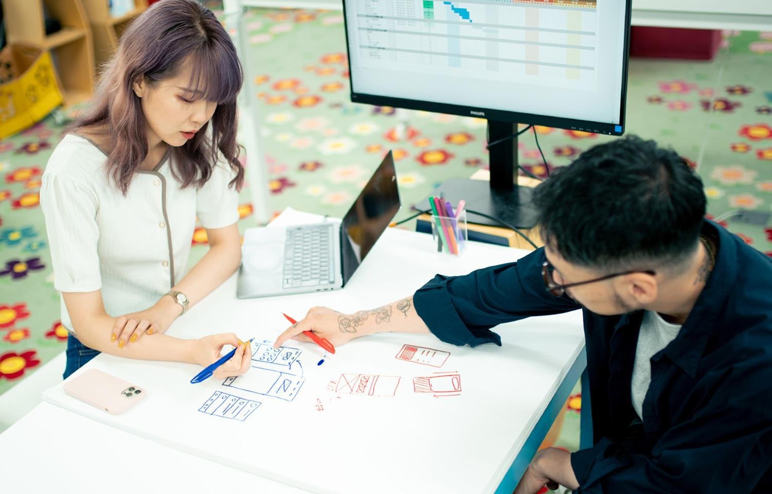 自身の担当する案件のワイヤーフレームに取り掛かる。 アドバイスをもらいつつ、より使いやすいデザインを考えながら形にしていきます。