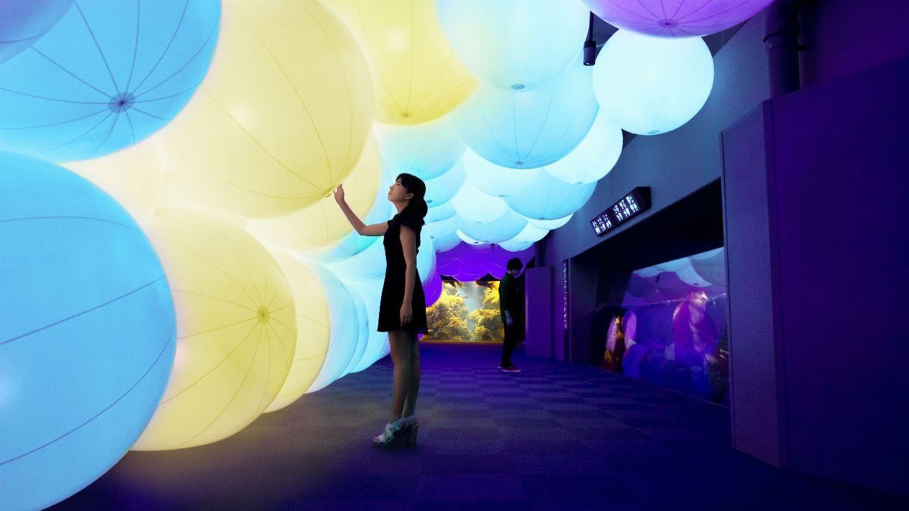 夜の新江ノ島水族館(神奈川/藤沢市)をデジタルアート空間にする「えのすい×チームラボ ナイトワンダーアクアリウム2015」にて、「呼応する球体と夜の魚たち / Resonating Spheres and Night Fish」を開催。会期は2015年7月18日(土)~2015年12月25日(金)。