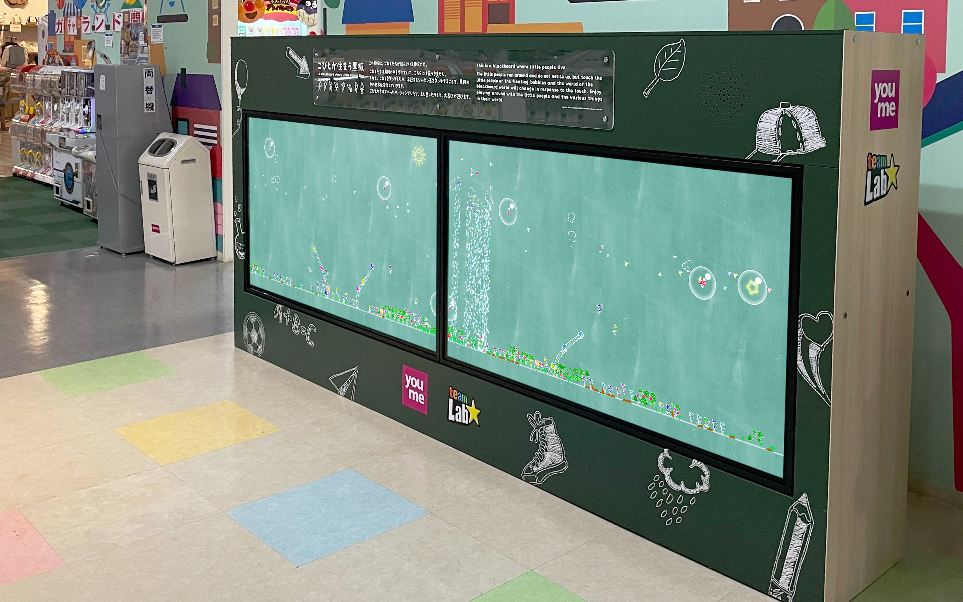 黒板の中のこびとやユーくん、メーちゃん、シャボン玉などにタッチしたり、線を引いたりすると、インタラクティブに世界が変化していきます。