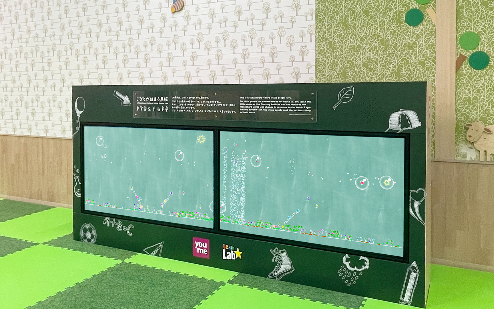 黒板の中のこびとやユーくん、メーちゃん、シャボン玉などにタッチしたり、線を引いたりすると、インタラクティブに世界が変化していきます。
